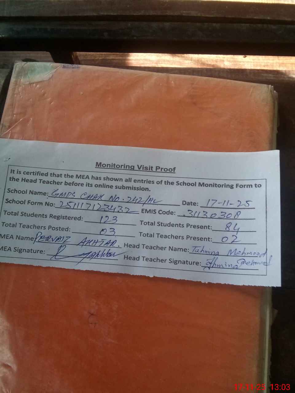 | EMIS Code: 31130308 | Name of School: GMPS CHAK NO. 242 HL | |||