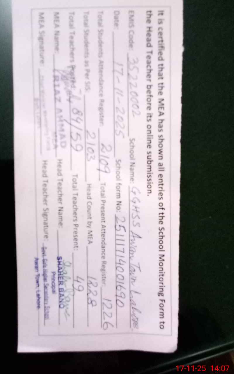 | EMIS Code: 35220002 | Name of School: GGHSS AWAN TOWN | |||