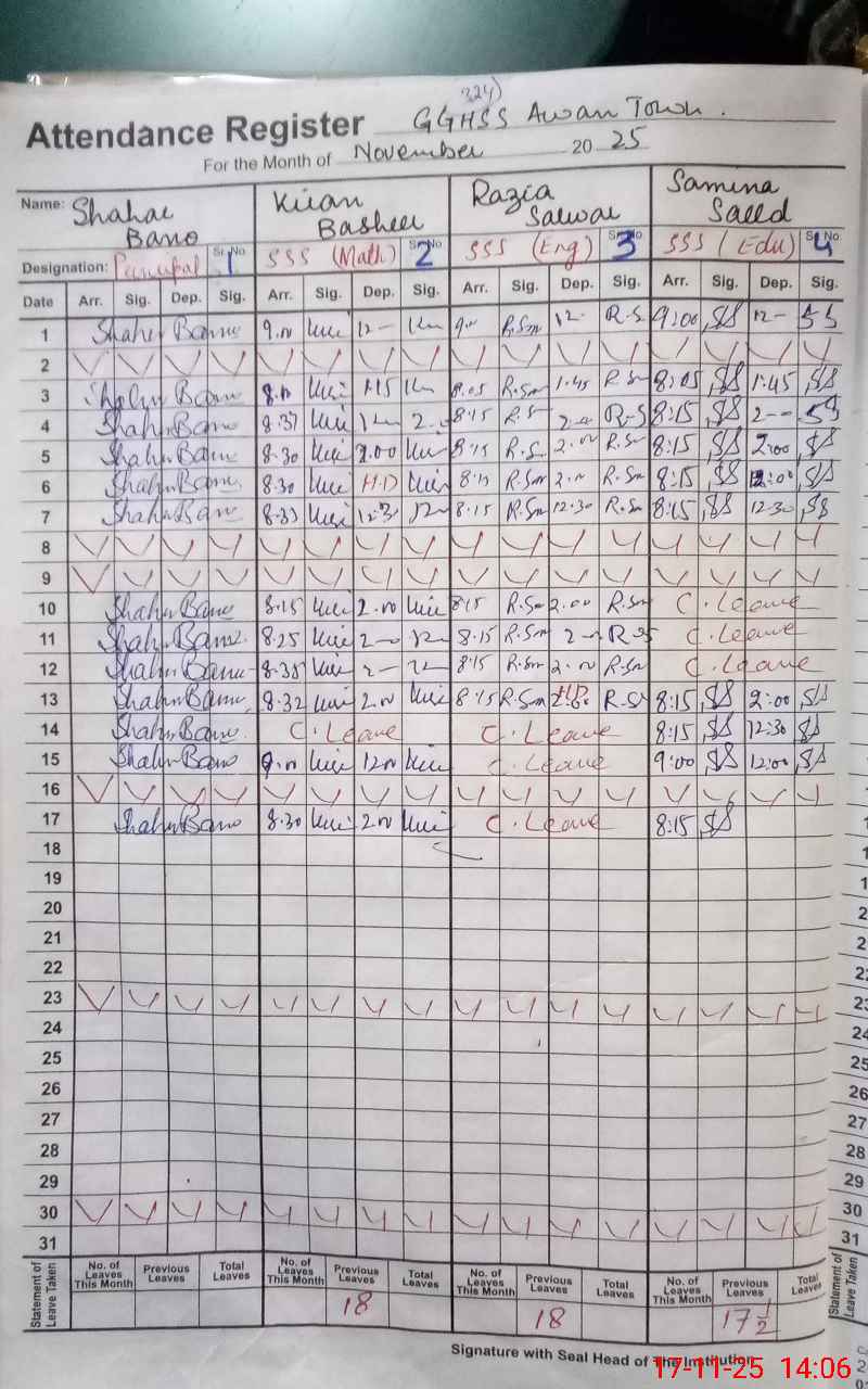 | 35**** | Ta**** Na**** | ESE Arts | Regular | 0 | 0 | 0 | 0 | 0 | 0 | 0 | 0 | 0 | Exam Duty |