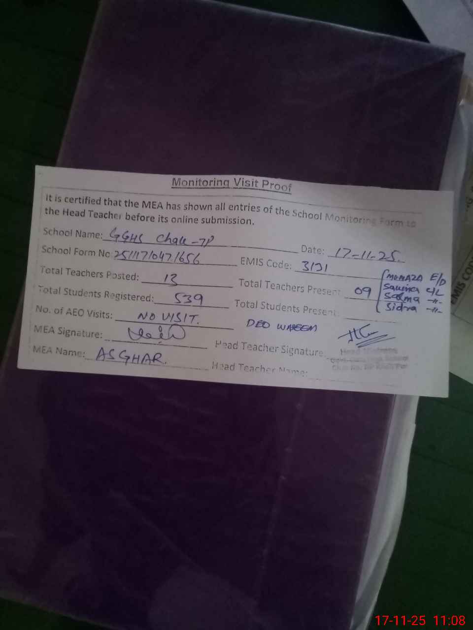 | Attendance Register | Head Teacher | MEA with School | Visit Proof |