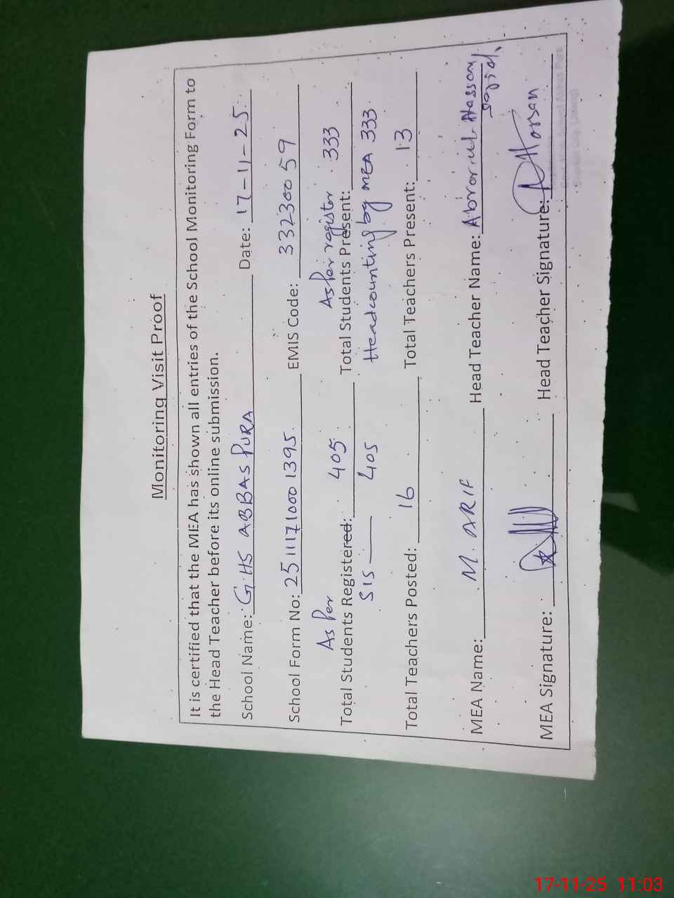 | Attendance Register | Head Teacher | MEA with School | Visit Proof |