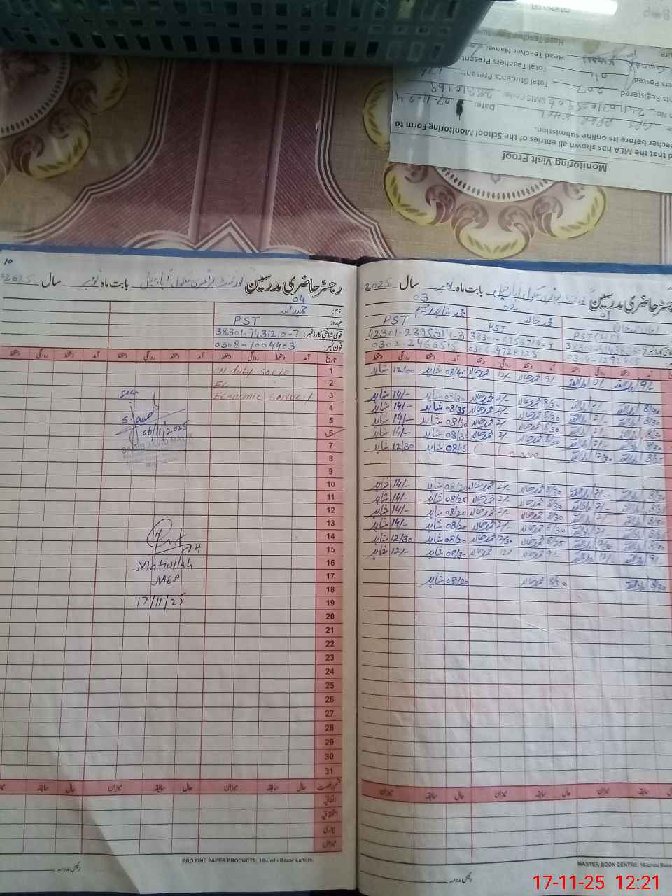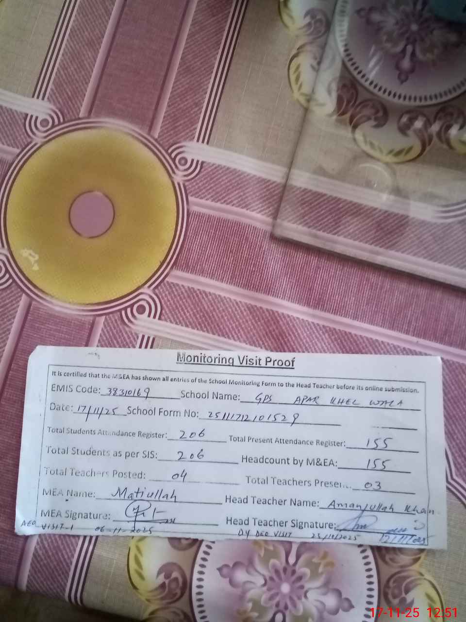 | Attendance Register | Head Teacher | MEA with School | Visit Proof |