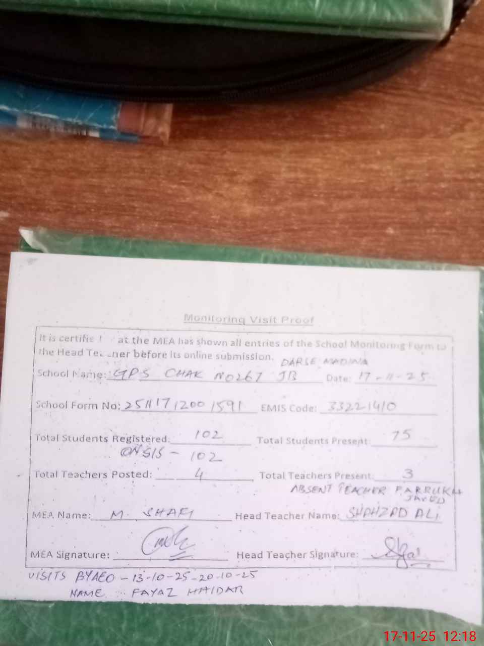 | EMIS Code: 33221410 | Name of School: GPS CHAK NO. 267 JB DARS-E-MADINA | |||