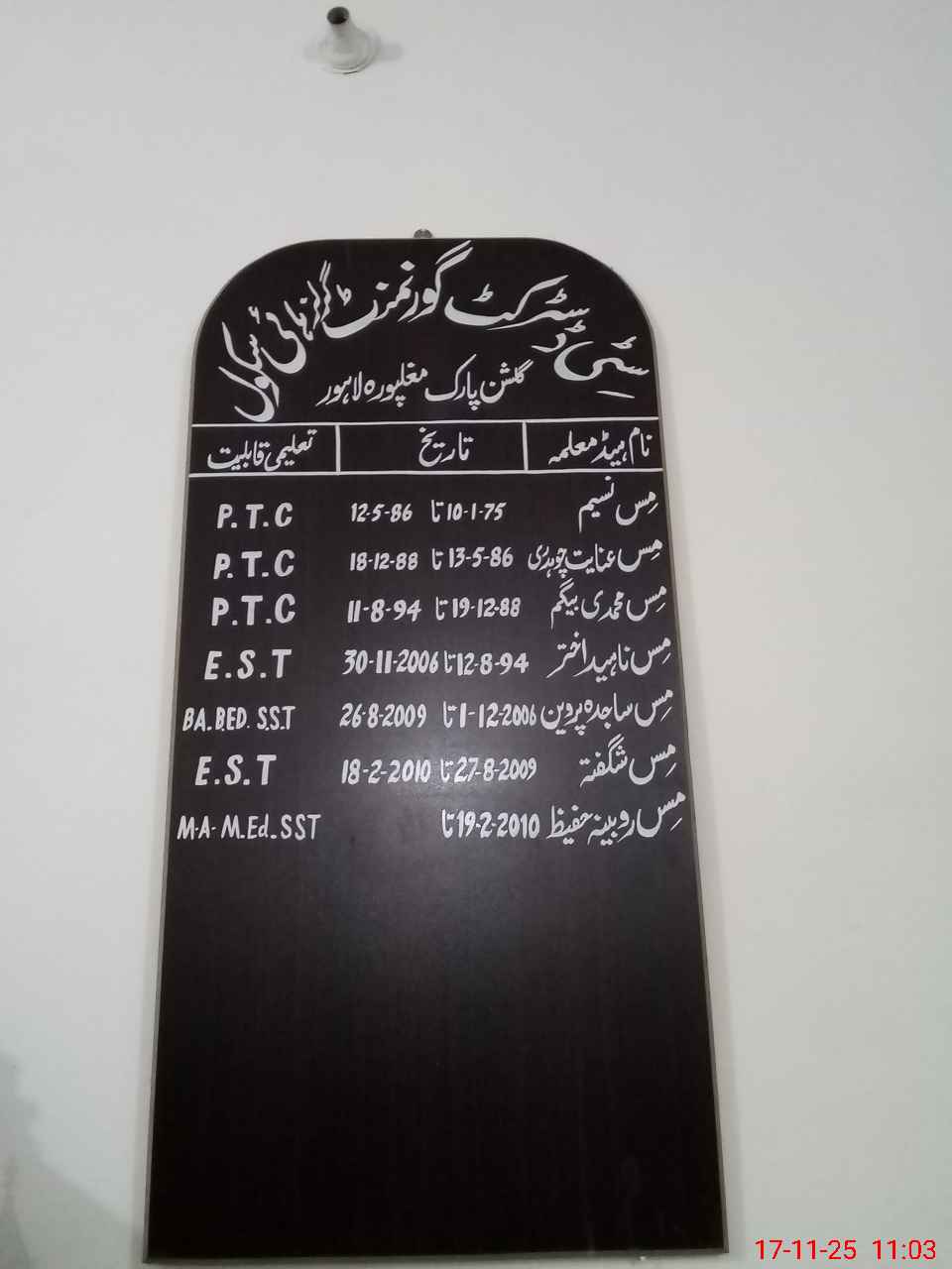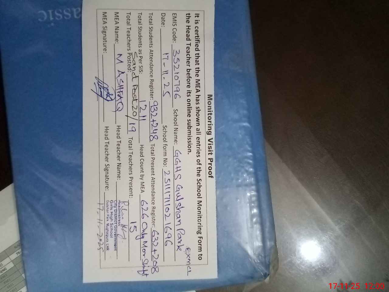 | EMIS Code: 35210796 | Name of School: GGHS GULSHAN PARK (EX-MCL) | |||