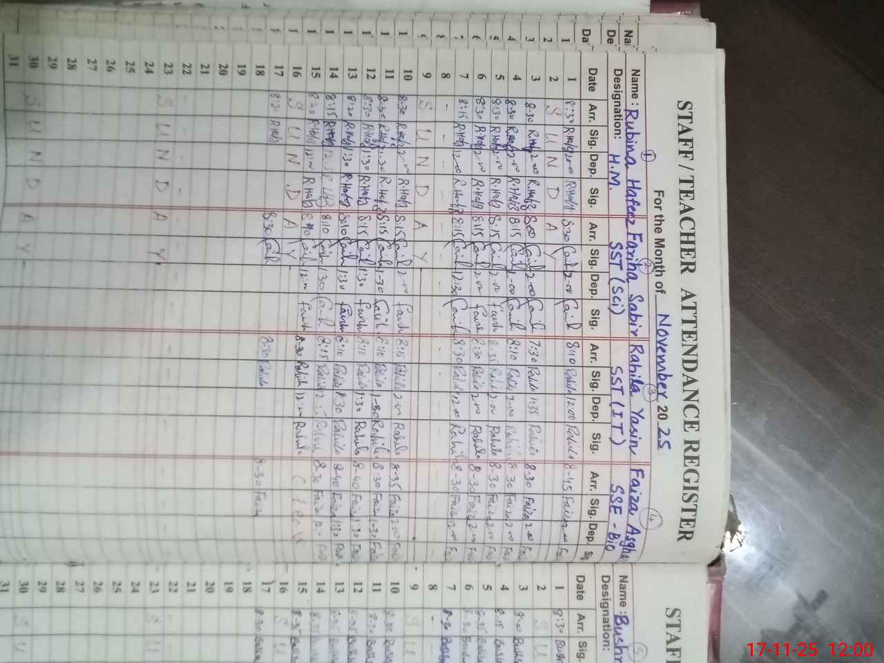 | Remarks (Use Separate Page if Required): Total Sanctioned Post of Teachers 20 and Filled 19 AEO Bilal visited on 04 November 25 EST Nasreen Kausar PST Nusrat Mehnaz and PST Nadia Gil applied casual leave today but still waiting for approval so mark them absent today 38210796 | |||||
