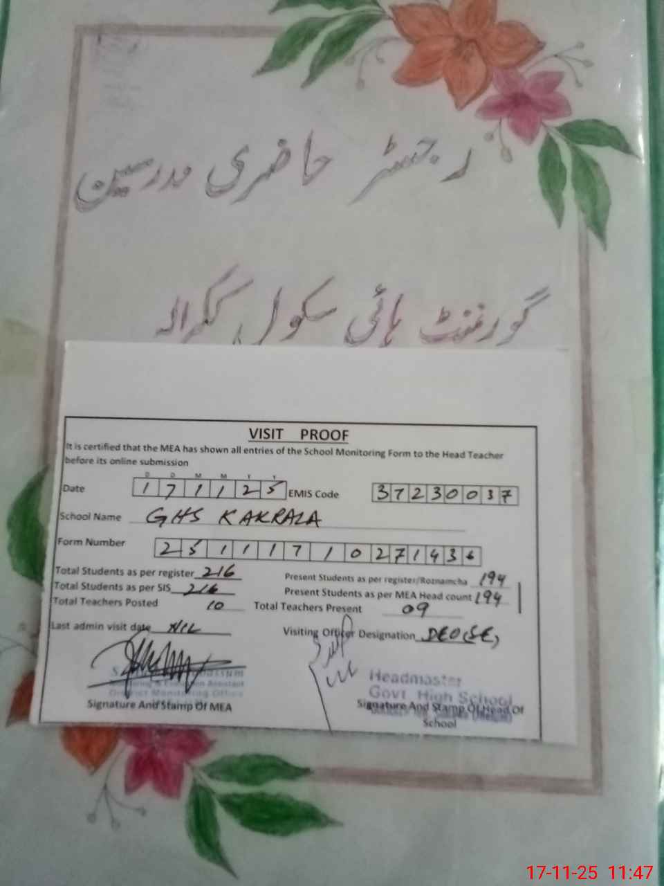 | Attendance Register | Head Teacher | MEA with School | Visit Proof |