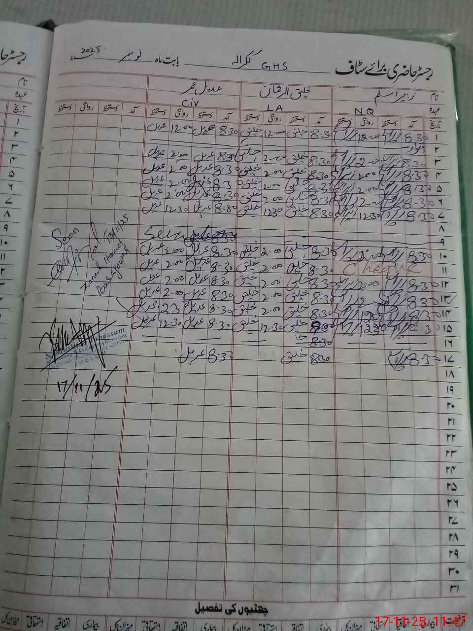 | CNIC | Full Name | Designation | R/C | Absence During Last Calender Month |