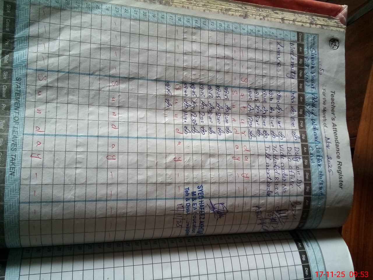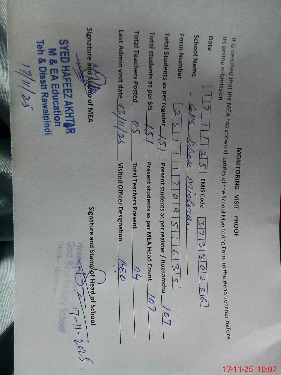 | Monitoring Date: 17-11-2025 | Start Time: 17-11-2025 09:37 AM | End Time: 17-11-2025 10:09 AM | Name of MEA: Sy**** Ha**** Ak**** | |