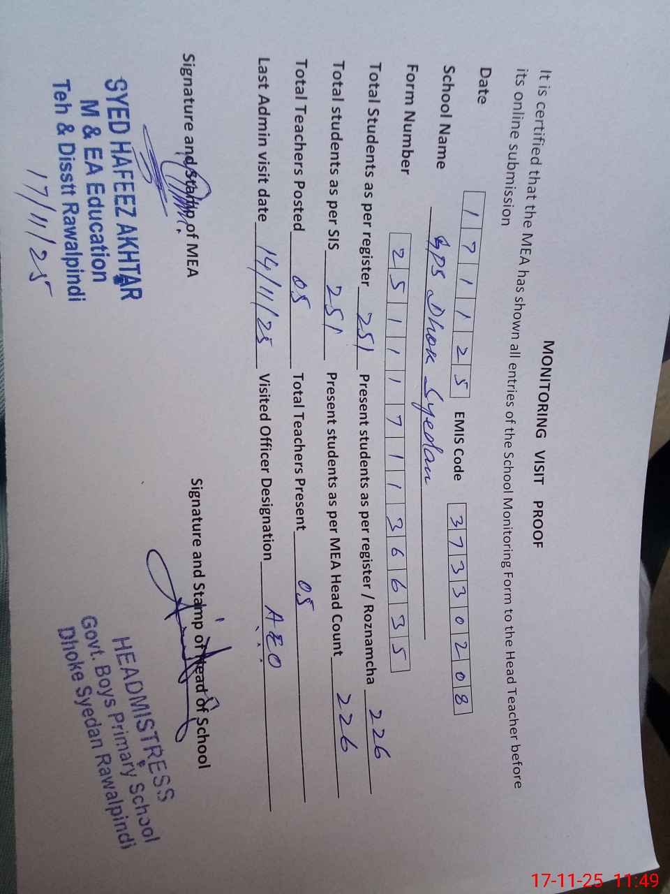 | Certified that this School was Inspected by the Undersigned MEA/DMO Today and the Information Stated Above is as Per Record. | |||||