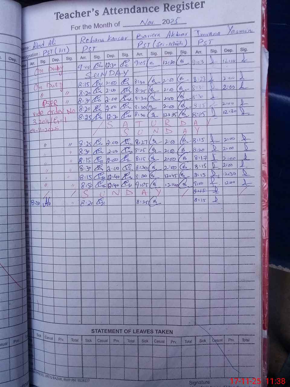 | CNIC | Full Name | Designation | R/C | Absence During Last Calender Month |