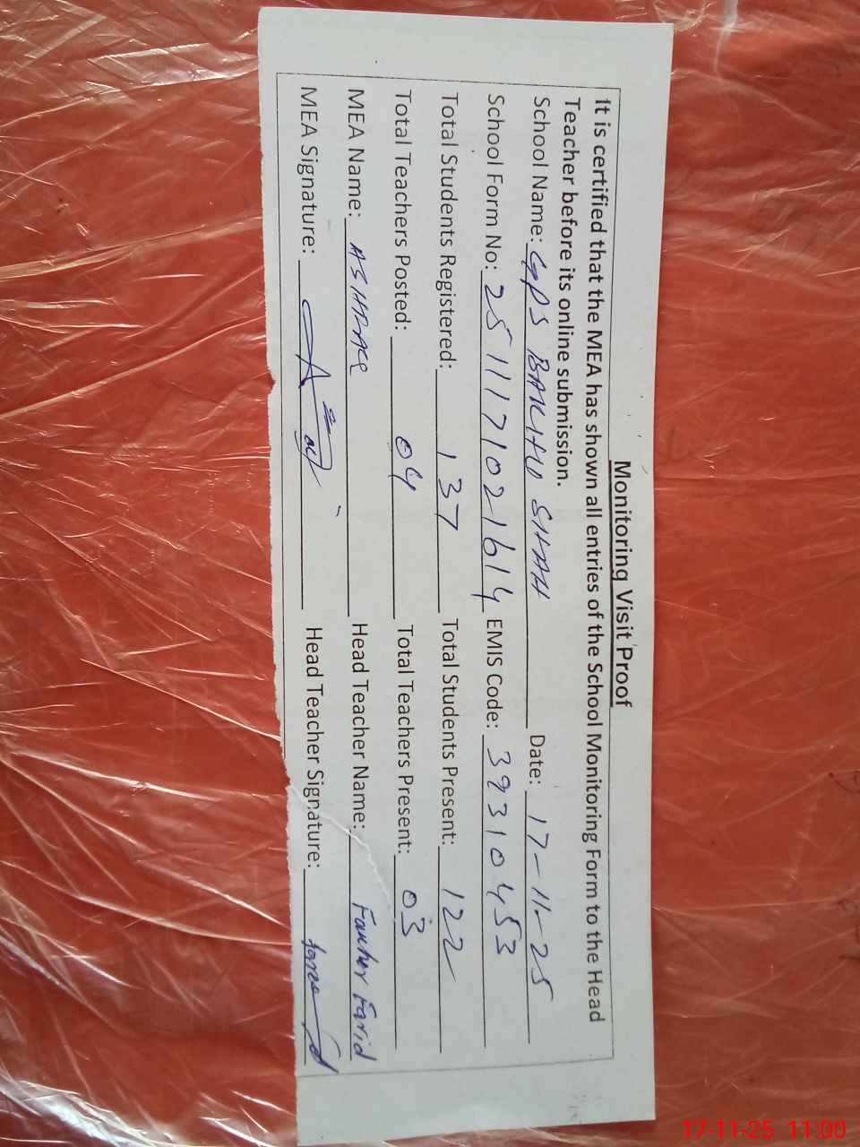 | Attendance Register | Head Teacher | MEA with School | Visit Proof |