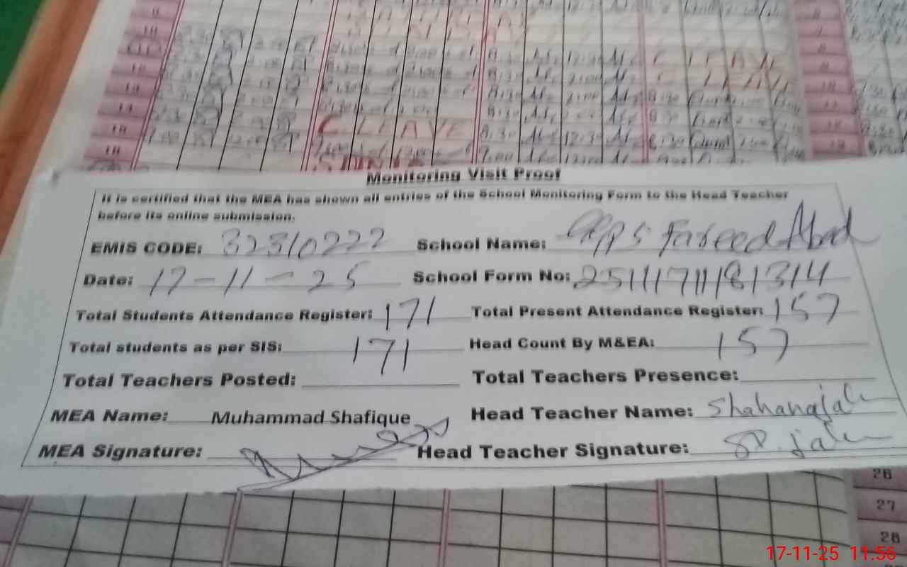 | Attendance Register | Head Teacher | MEA with School | Visit Proof |