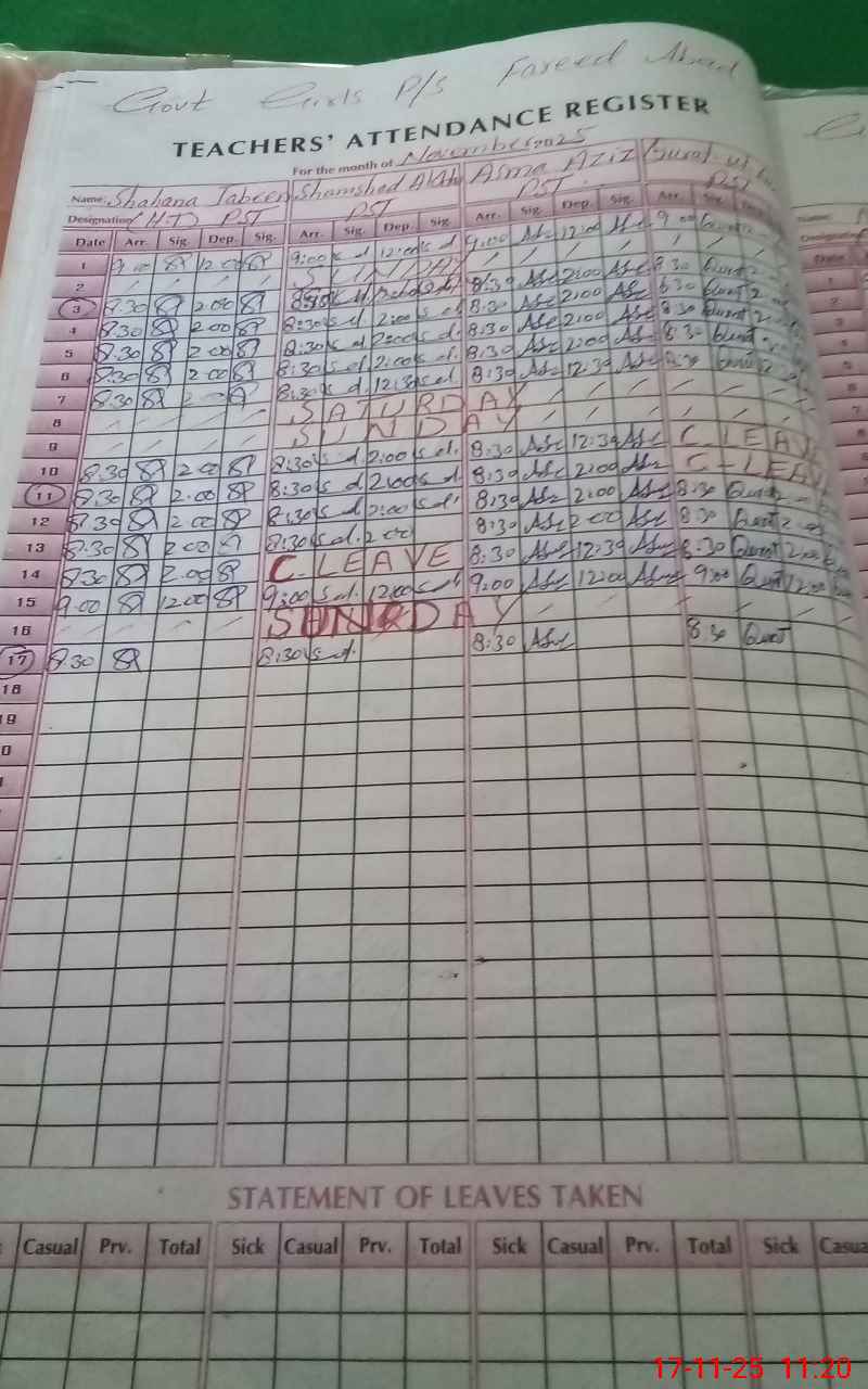 | CNIC | Full Name | Designation | R/C | Absence During Last Calender Month |