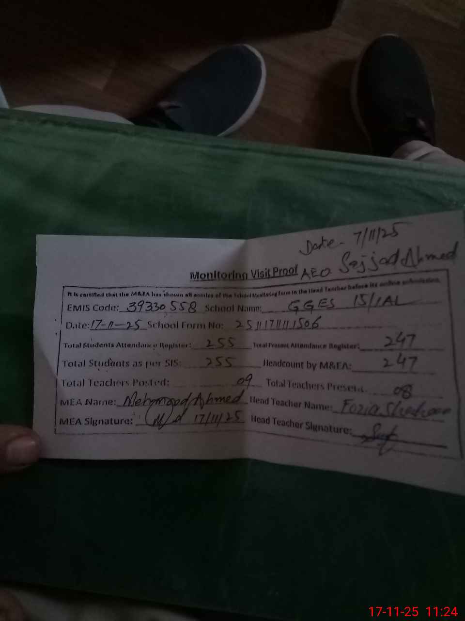 | Monitoring Date: 17-11-2025 | Start Time: 17-11-2025 11:11 AM | End Time: 17-11-2025 11:37 AM | Name of MEA: ME**** AH**** | |