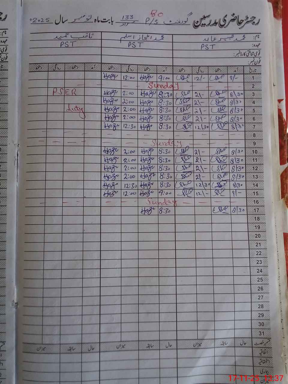 | CNIC | Full Name | Designation | R/C | Absence During Last Calender Month |