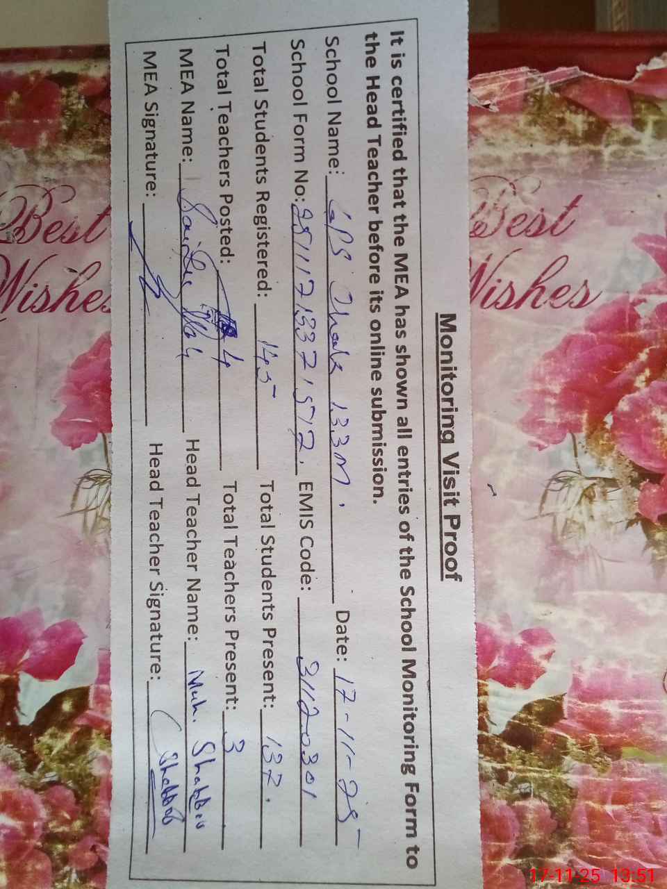 | Attendance Register | Head Teacher | MEA with School | Visit Proof |