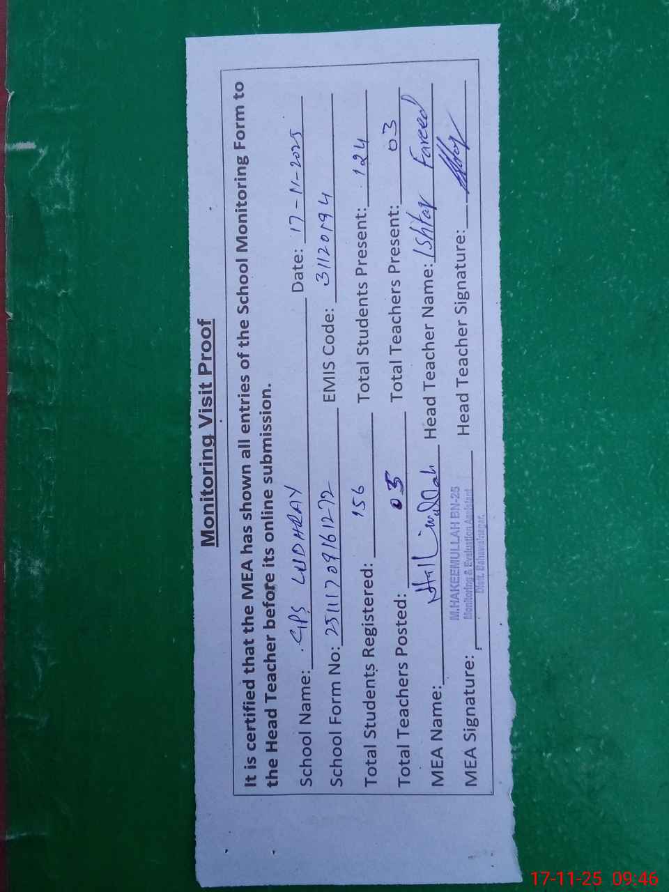 | Attendance Register | Head Teacher | MEA with School | Visit Proof |