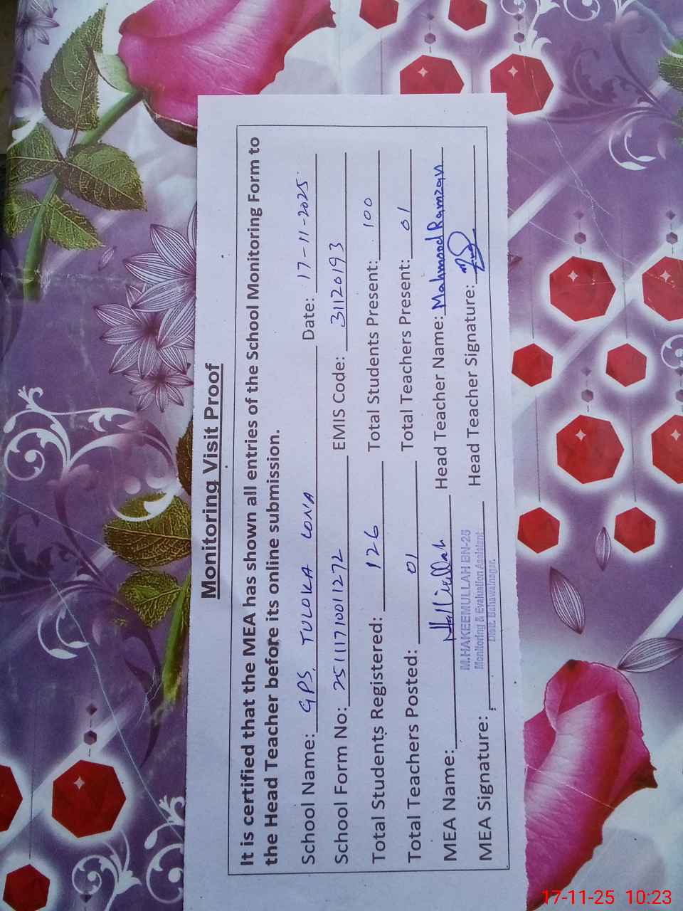| Attendance Register | Head Teacher | MEA with School | Visit Proof |