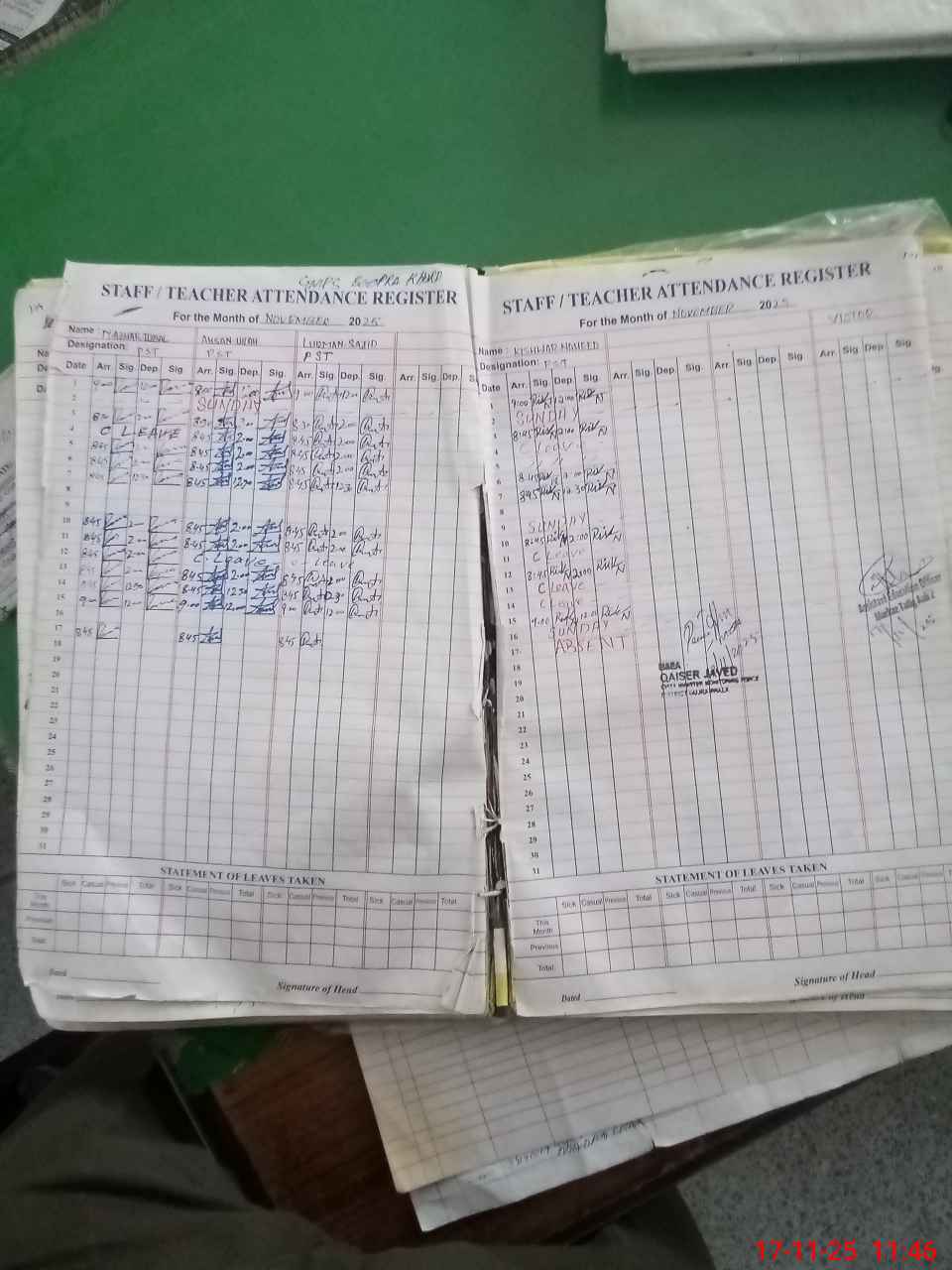 | CNIC | Full Name | Designation | R/C | Absence During Last Calender Month |