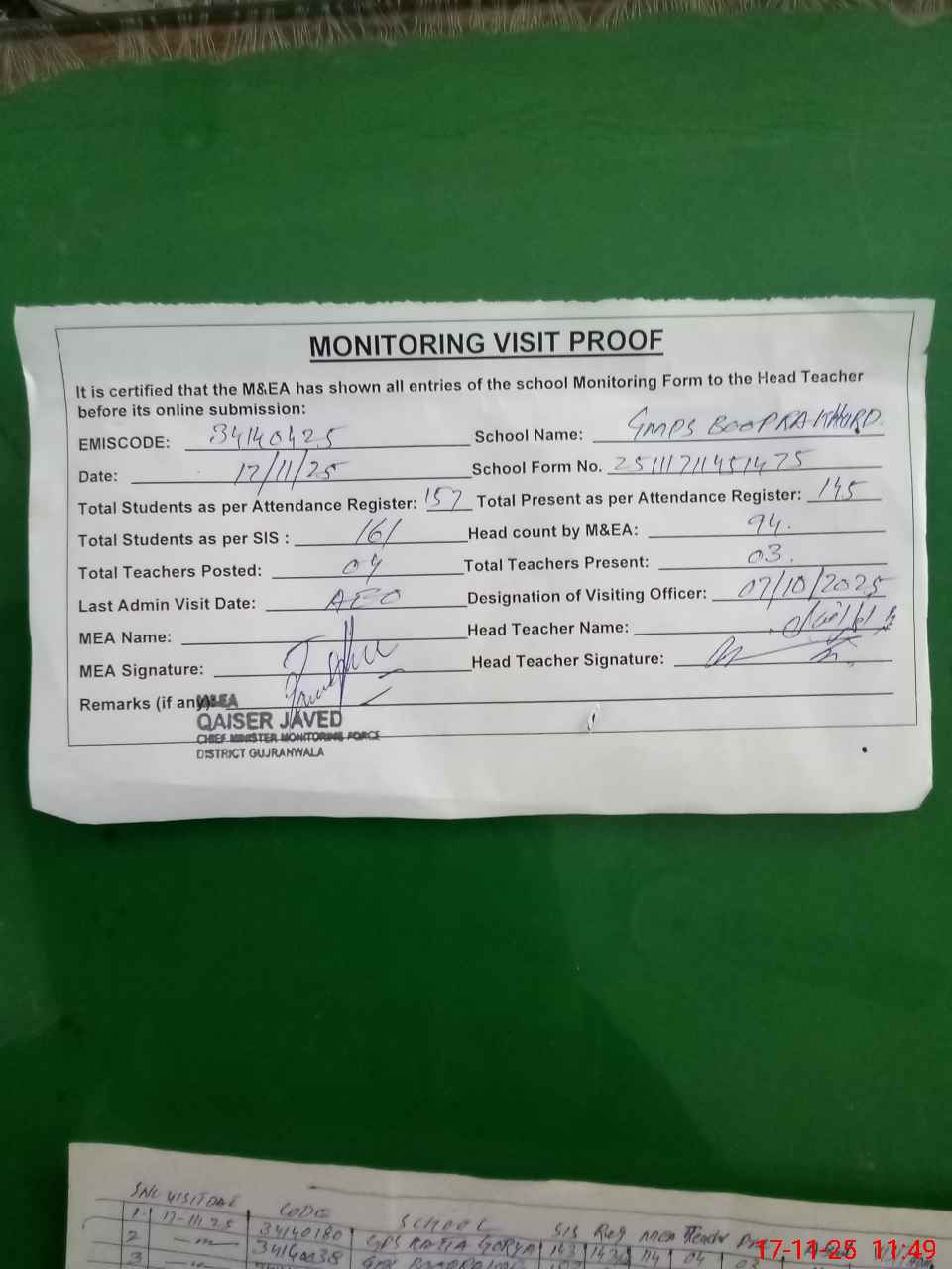 | Attendance Register | Head Teacher | MEA with School | Visit Proof |