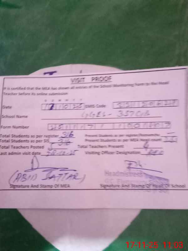 | Attendance Register | Head Teacher | MEA with School | Visit Proof |
