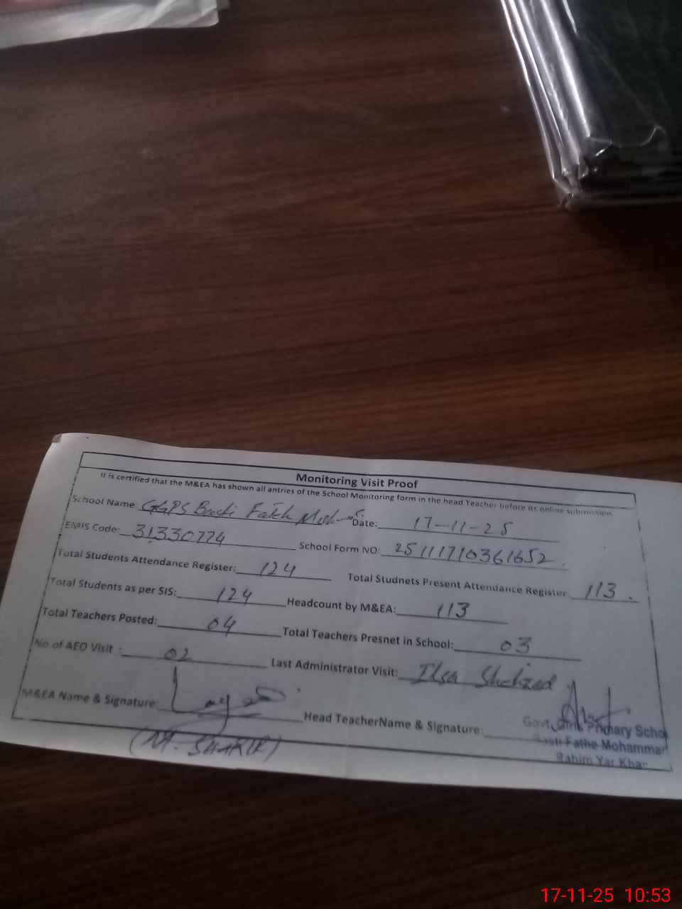 | Attendance Register | Head Teacher | MEA with School | Visit Proof |