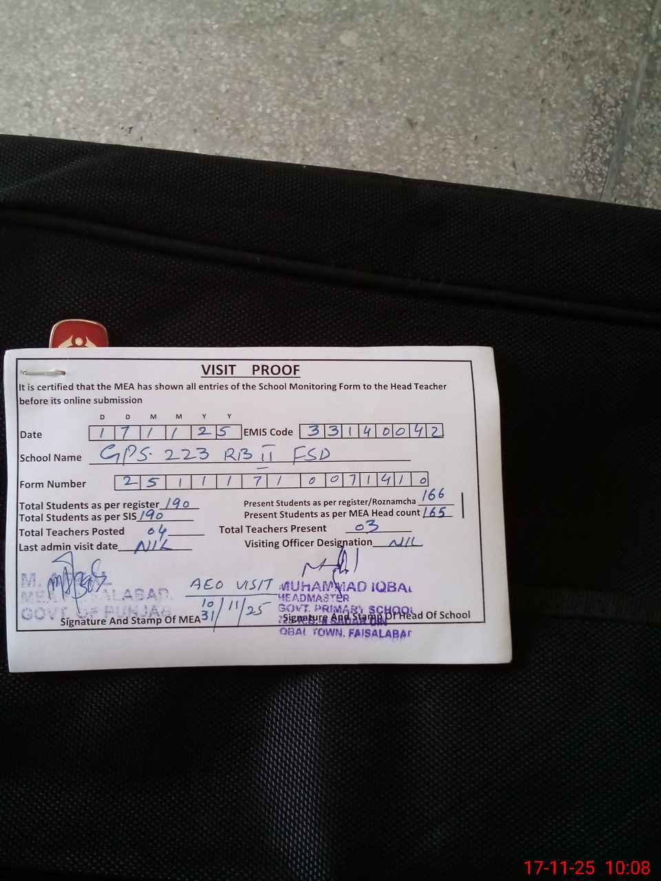 | District: FAISALABAD | Tehsil: FAISALABAD CITY | Markaz: CITY 3 - MALE | Level: Primary | |