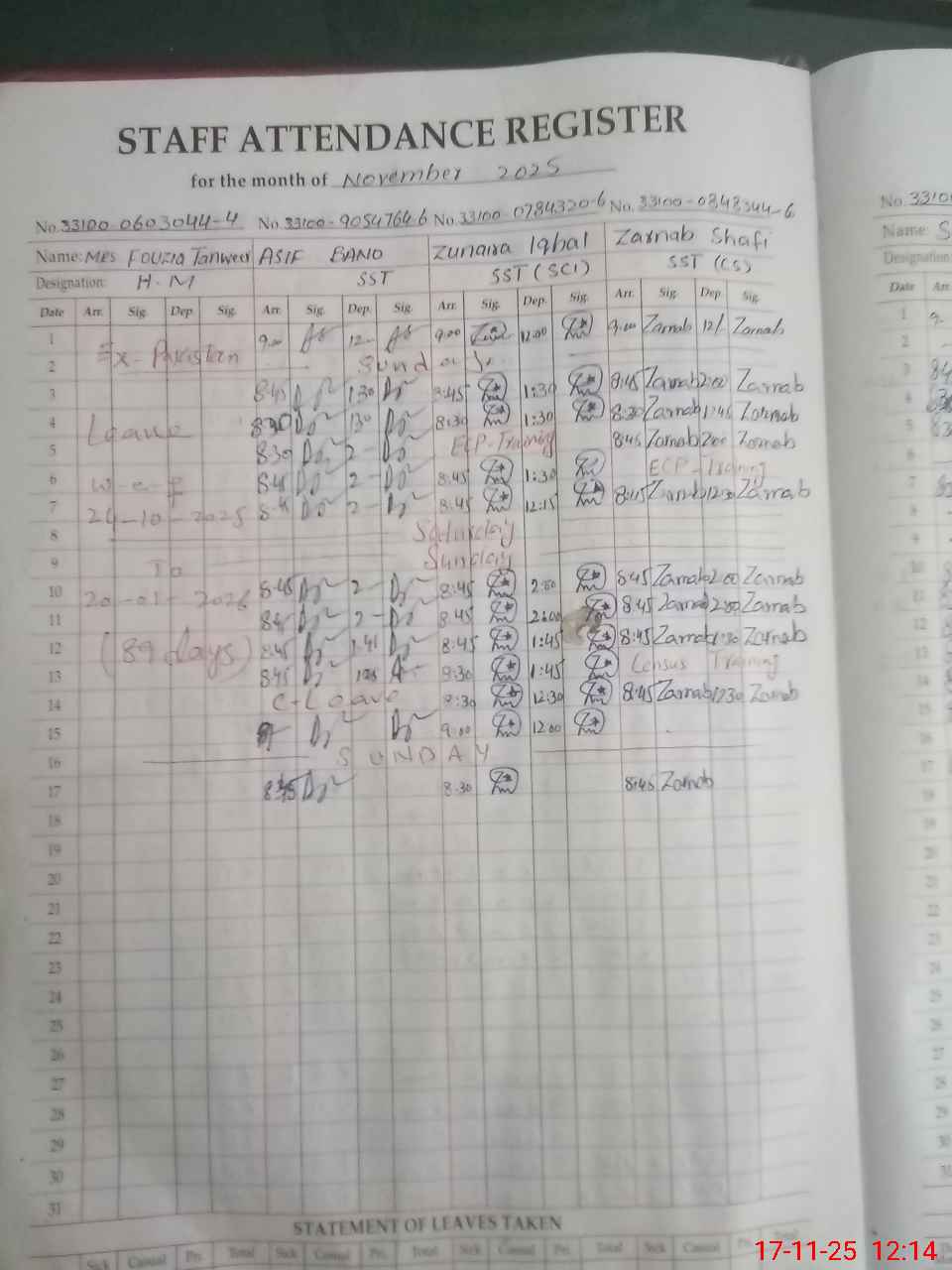 | 33**** | Ak**** Ra**** | J C | Regular | 1 | 0 | 0 | 0 | 0 | 0 | 0 | 0 | 1 | Exam Duty |