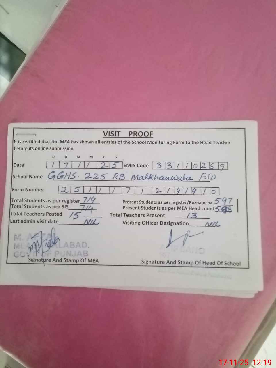 | EMIS Code: 33110269 | Name of School: GGHS CHAK NO 225 RB | |||