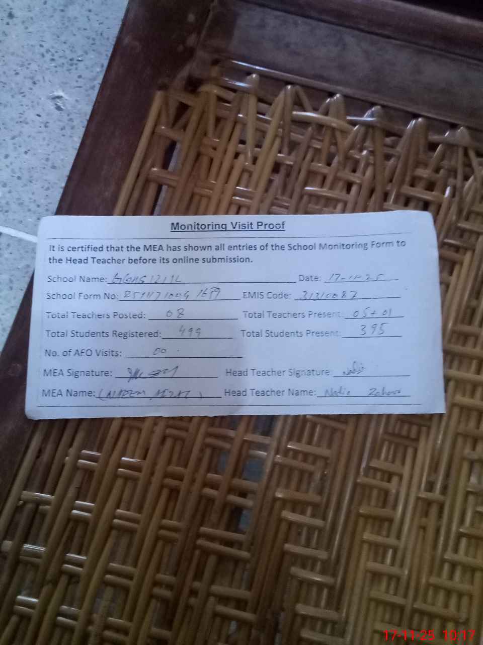 | Attendance Register | Head Teacher | MEA with School | Visit Proof |