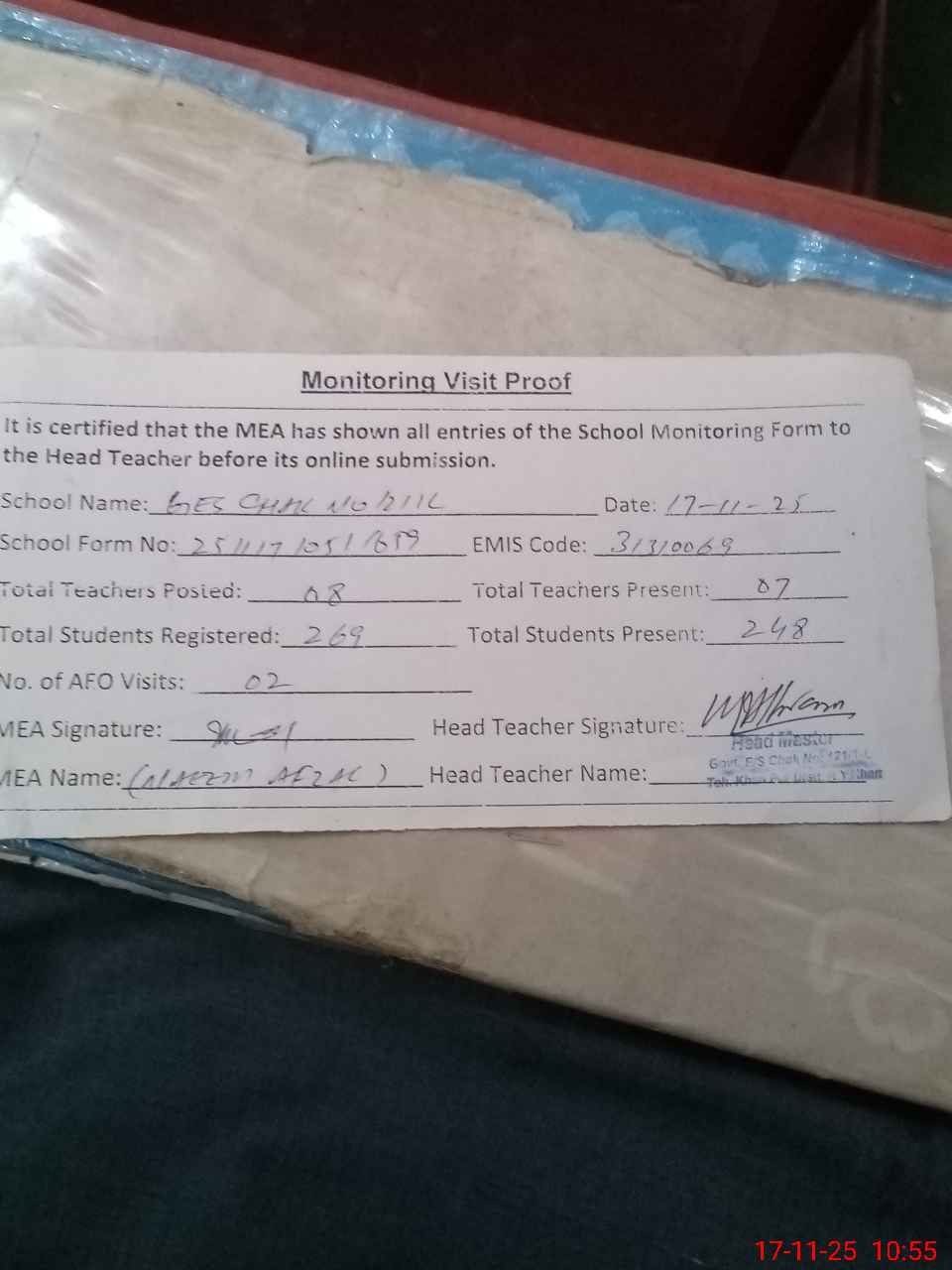 | Attendance Register | Head Teacher | MEA with School | Visit Proof |