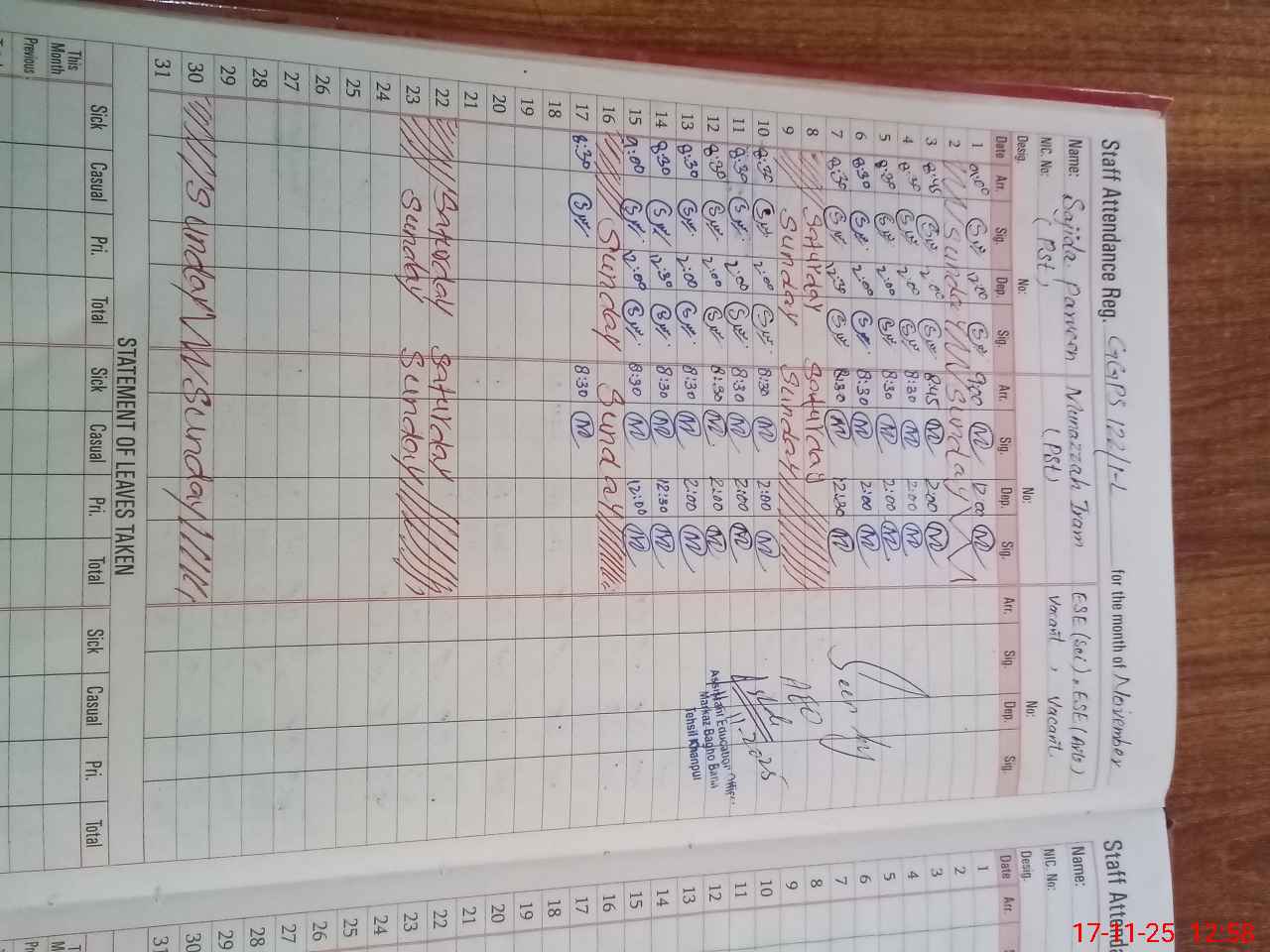 | CNIC | Full Name | Designation | R/C | Absence During Last Calender Month |