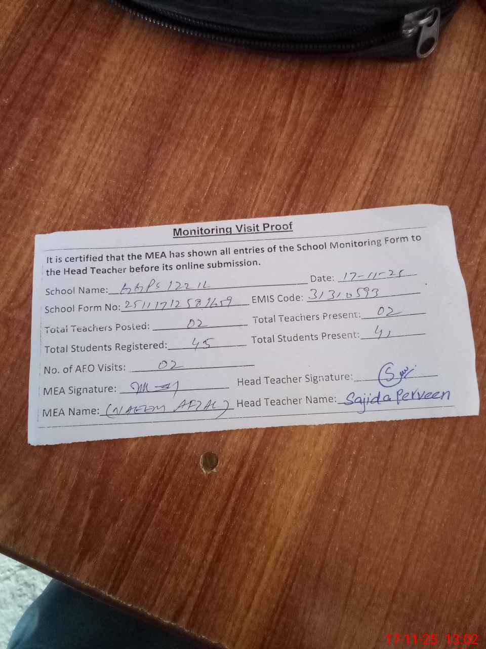 | Attendance Register | Head Teacher | MEA with School | Visit Proof |