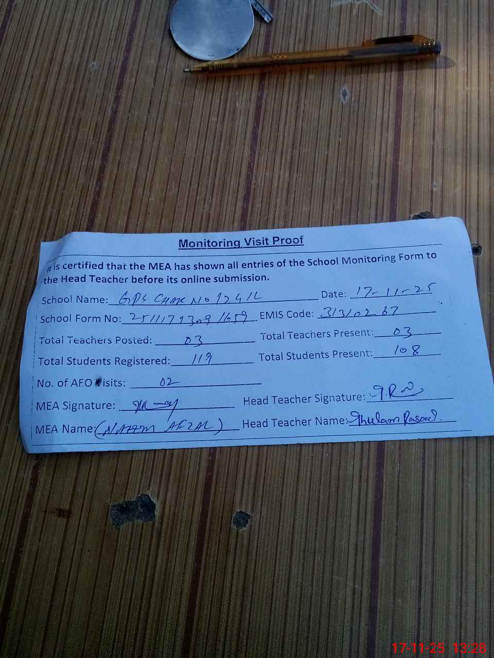 | Attendance Register | Head Teacher | MEA with School | Visit Proof |