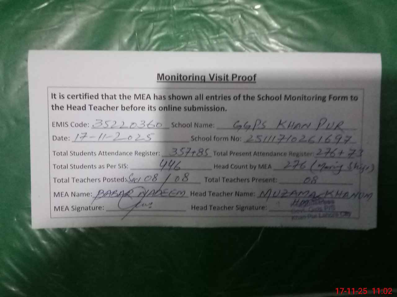 | Attendance Register | Head Teacher | MEA with School | Visit Proof |