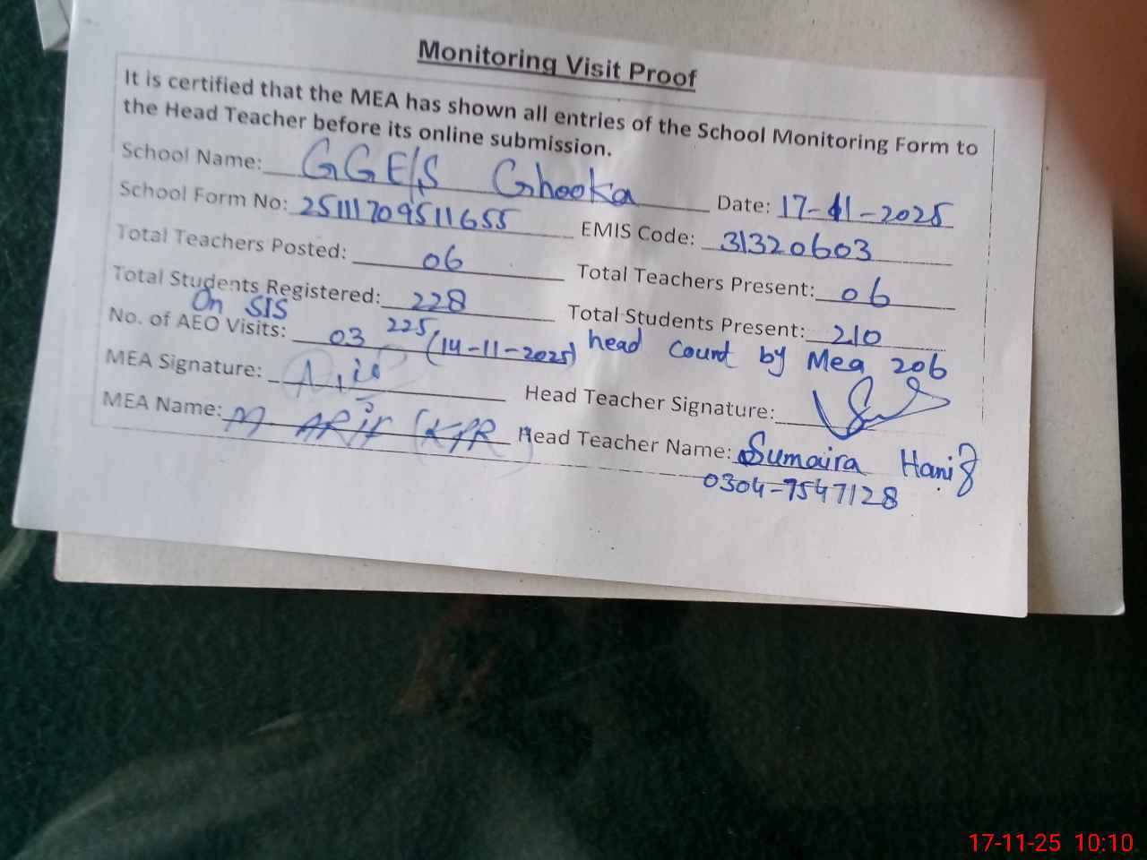 | Attendance Register | Head Teacher | MEA with School | Visit Proof |