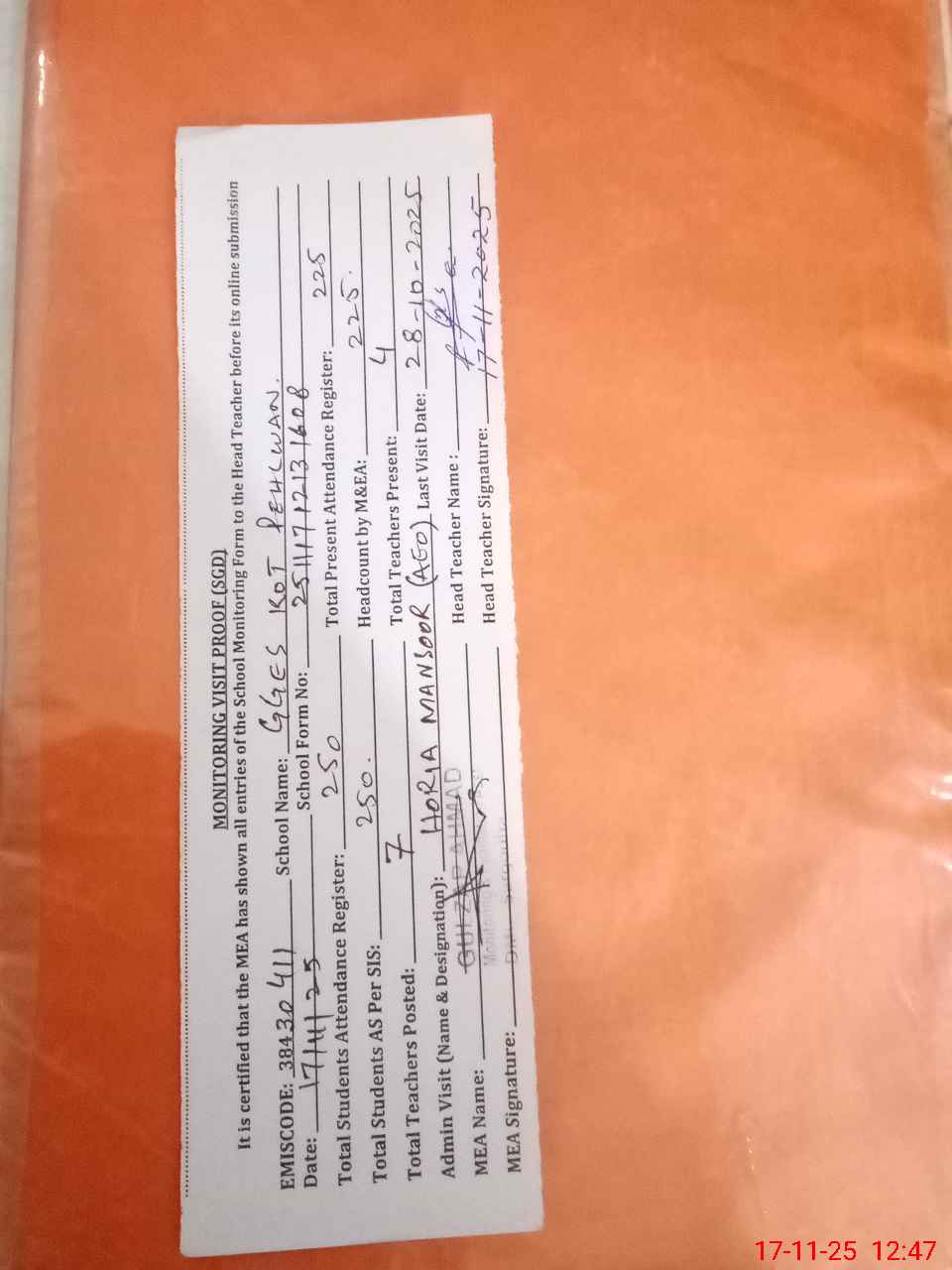 | Attendance Register | Head Teacher | MEA with School | Visit Proof |