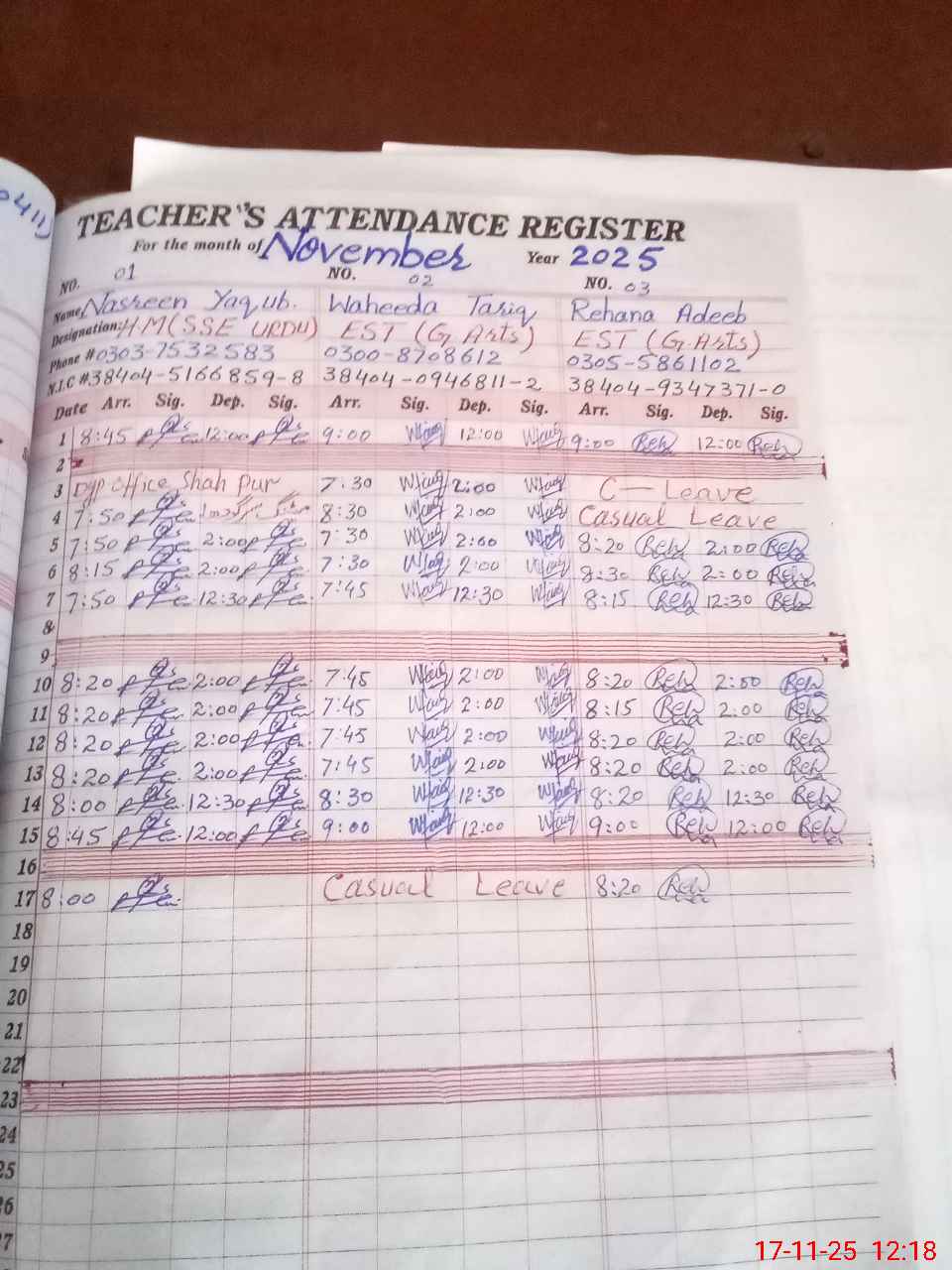 | CNIC | Full Name | Designation | R/C | Absence during last cal. month |
