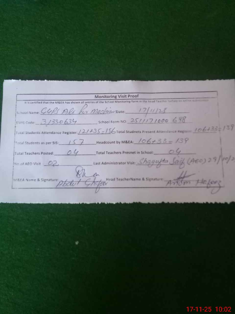 | EMIS Code: 31330634 | Name of School: GGPS ALI PUR MACHIAN | |||