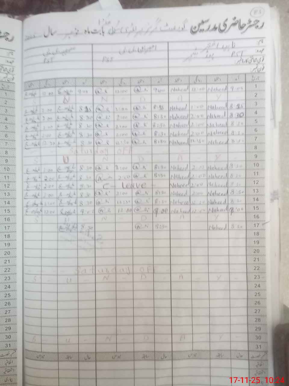 | CNIC | Full Name | Designation | R/C | Absence During Last Calender Month |