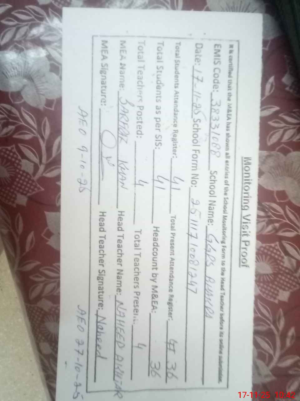 | Attendance Register | Head Teacher | MEA with School | Visit Proof |