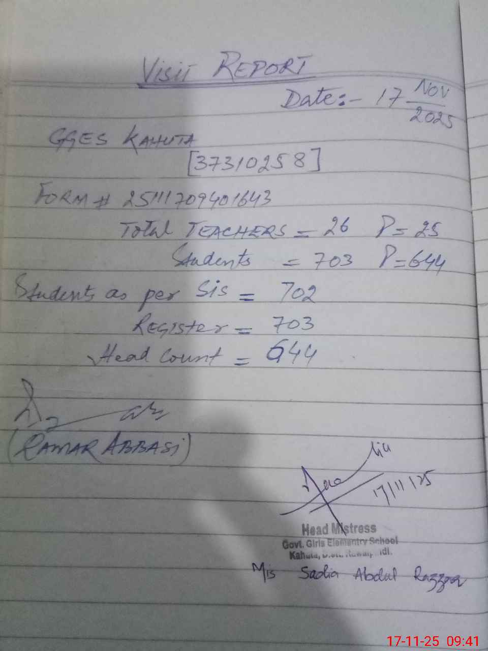 | Attendance Register | Head Teacher | MEA with School | Visit Proof |