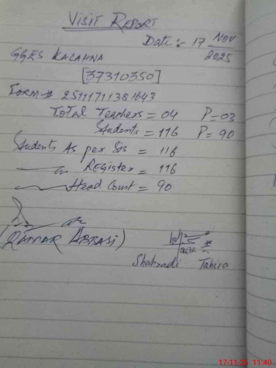 | Attendance Register | Head Teacher | MEA with School | Visit Proof |