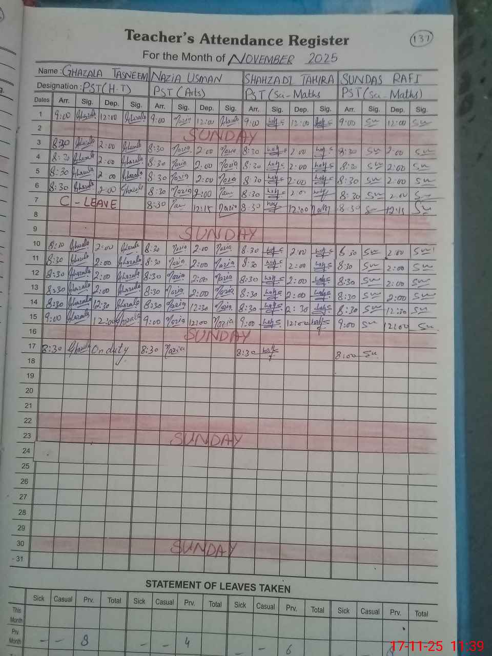 | CNIC | Full Name | Designation | R/C | Absence During Last Calender Month |