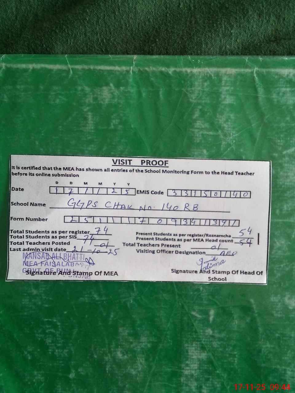 | Attendance Register | Head Teacher | MEA with School | Visit Proof |