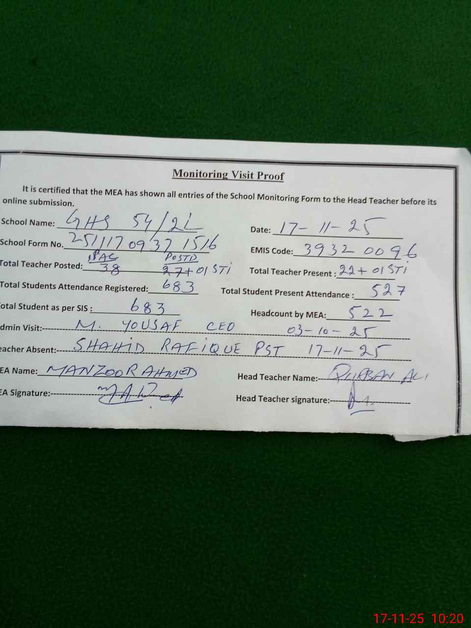 | Monitoring Date: 17-11-2025 | Start Time: 17-11-2025 09:37 AM | End Time: 17-11-2025 10:21 AM | Name of MEA: MA**** AH**** | |