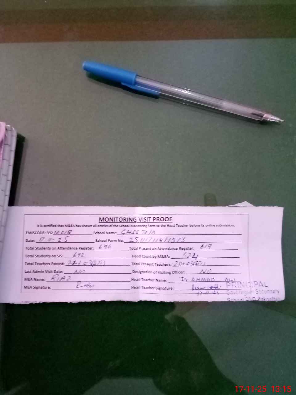 | Attendance Register | Head Teacher | MEA with School | Visit Proof |