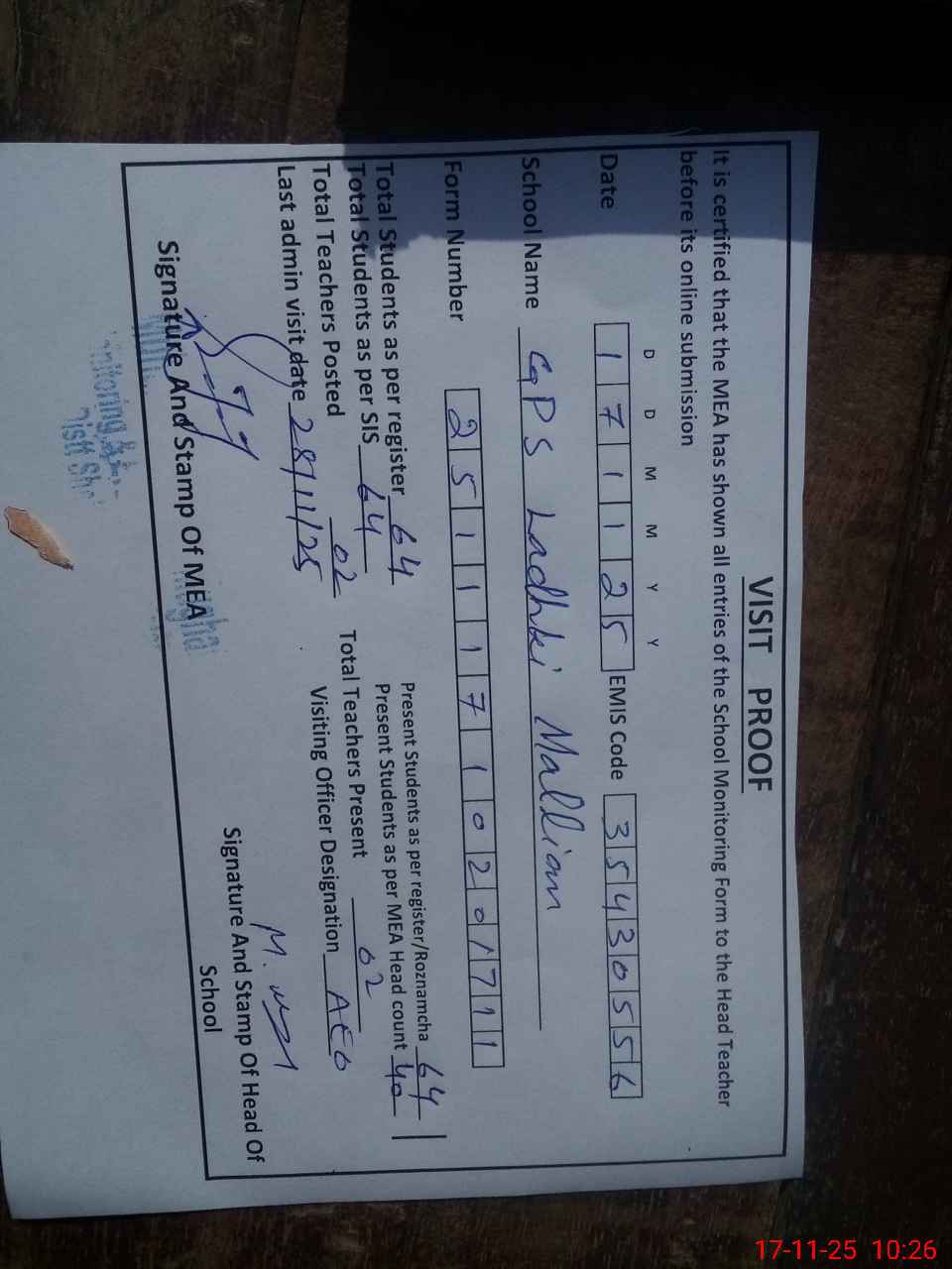 | Certified that this School was Inspected by the Undersigned MEA/DMO Today and the Information Stated Above is as Per Record. | |||||