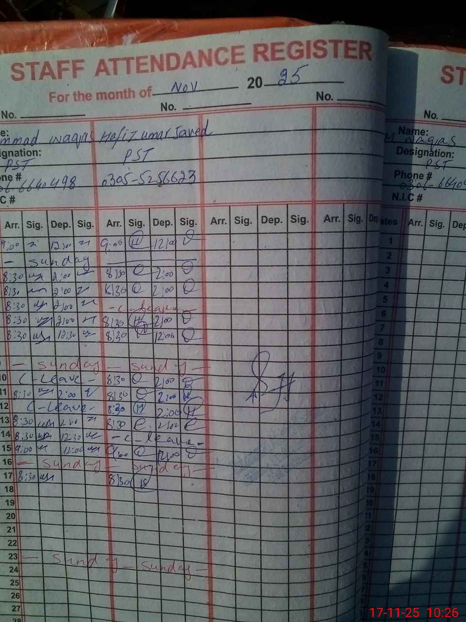 | CNIC | Full Name | Designation | R/C | Absence During Last Calender Month |