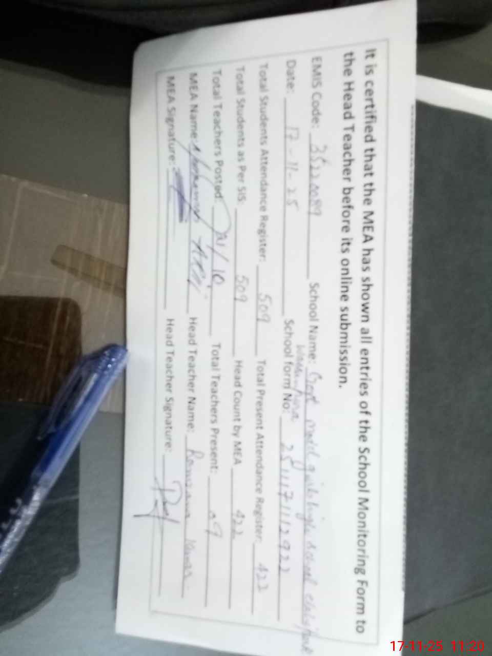 | Attendance Register | Head Teacher | MEA with School | Visit Proof |